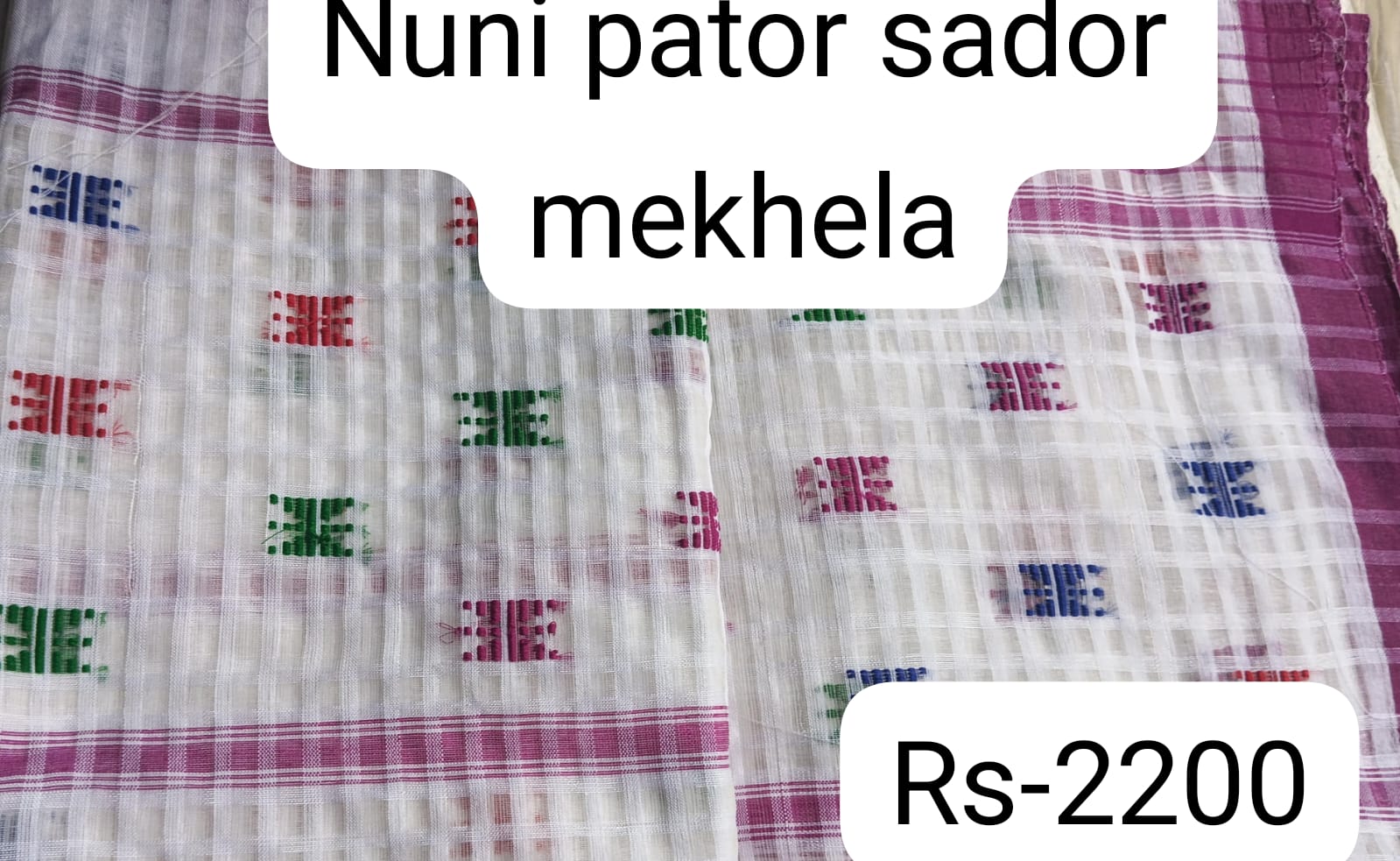 The Nuni Pator Sador Mekhela is a traditional Assamese attire made from “Nuni Pator,” a type of fine silk known for its smooth texture and lustrous finish. This elegant outfit consists of a mekhela (draped skirt) and a sador (shawl), often worn during special occasions and cultural events, reflecting the beauty and craftsmanship of Assamese weaving.