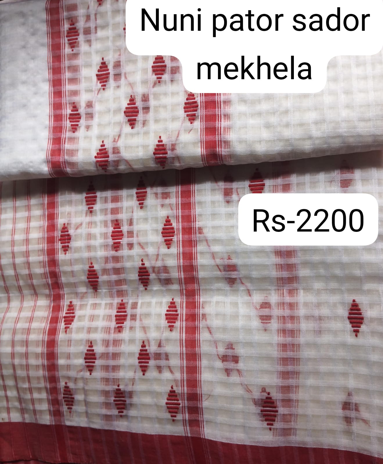The Nuni Pator Sador Mekhela is a traditional Assamese attire made from “Nuni Pator,” a type of fine silk known for its smooth texture and lustrous finish. This elegant outfit consists of a mekhela (draped skirt) and a sador (shawl), often worn during special occasions and cultural events, reflecting the beauty and craftsmanship of Assamese weaving.